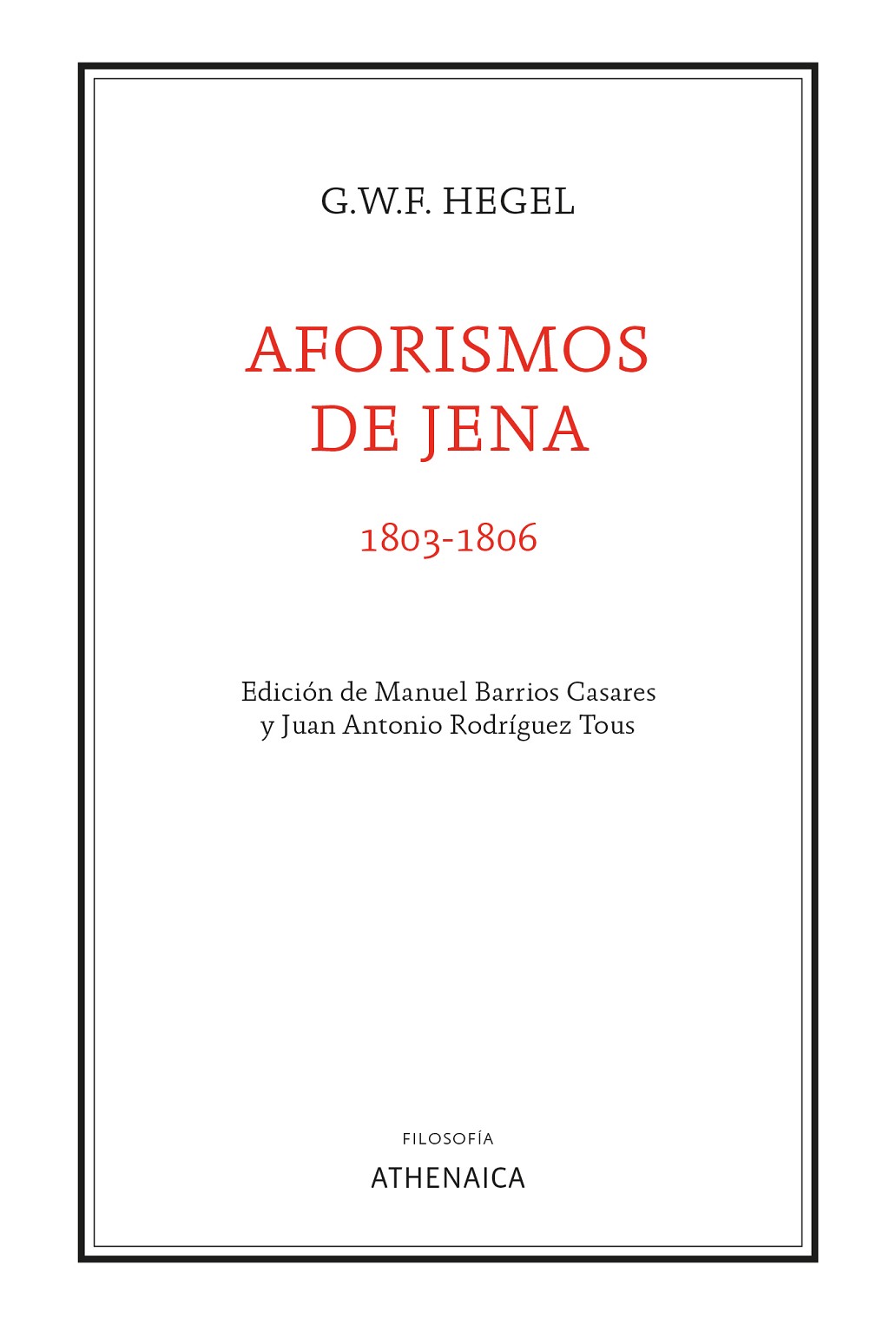 Escritos en un estilo desenfadado y directo, los Aforismos de Jena fueron redactados por Hegel entre 1803 y 1806, años en los que comenzó a componer su primera gran obra, la Fenomenología del Espíritu. El filósofo alemán somete aquí su propio tiempo a un juicio sumarísimo: el mundo moderno, época del triunfo de la Razón y la Libertad, tiene poderosos enemigos, y contra ellos dirige sus invectivas, siempre certeras. Nostálgicos del Antiguo Régimen, románticos anti-ilustrados o viejos racionalistas escolásticos son vapuleados con una contundencia rayana en ocasiones con un hilarante gamberrismo intelectual. La mordacidad de Hegel no se limita a los debates filosóficos o políticos del periodo, sino que se extiende asimismo a la nueva mentalidad pequeño-burguesa. Sus ácidos apuntes sobre el auge del narcisismo sentimental, tan por desgracia vigente en nuestros días, no han perdido un ápice de validez. Merece la pena descubrir a este otro Hegel, pensador entregado a la crítica de la cultura antes que a la disquisición metafísica. Al cuidado de Manuel Barrios Casares y Juan Antonio Rodríguez Tous, esta nueva edición bilingüe de los Aforismos se acompaña de una esclarecedora introducción y de un aparato crítico de notas que localiza citas y referencias ignoradas hasta la fecha.