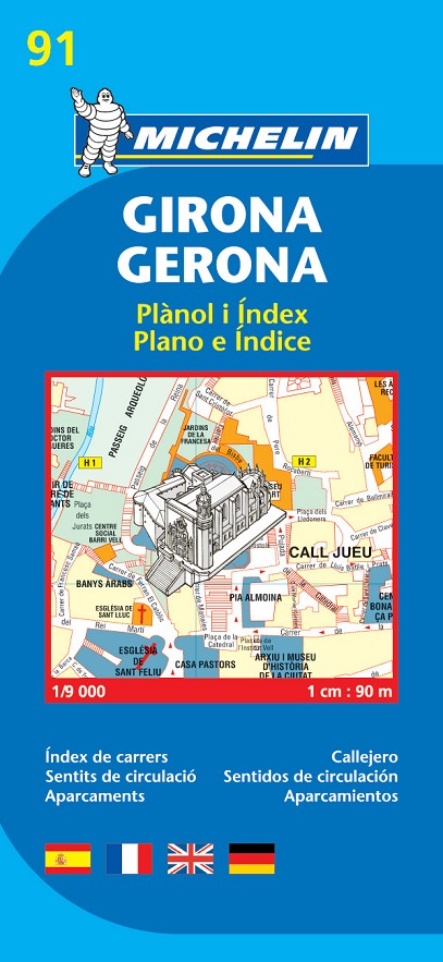 Encuentre todas las informaciones prácticas para recorrer Girona a pie, en coche o en bicicleta. El plano MICHELIN Girona, a escala 1/9 000 (1cm = 90m), es ideal para recorrer los barrios de la ciudad. Para completar la información incluye: transportes, sentidos de circulación, parkings... y un anexo con el índice de todas las calles.