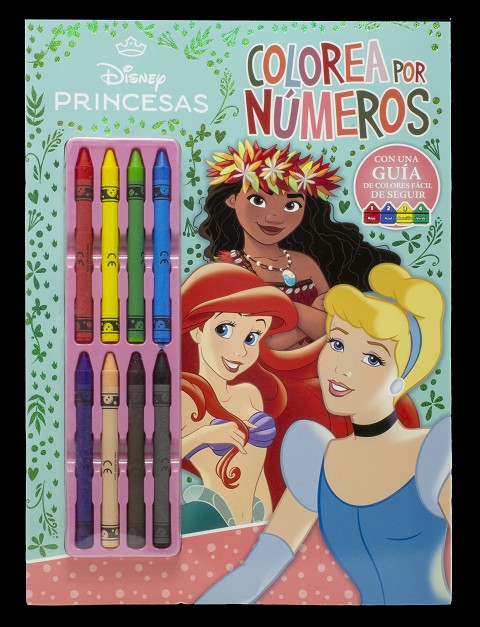Sigue la guía de números y colores para dar vida a las imágenes de las Princesas Disney y sus amigos en este libro para colorear con ceras.